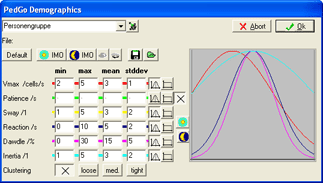 All persons in the simulation basically use the same movement algorithm. To take the variation of abilities into account, every person has her own parameters that influence her behaviour. Of course, the list of factors affecting a persons movement is nearly endless. However, at the end of the day, the movement of a person from a physical point of view is only characterized by her speed and her direction. This way, the number of parameters characterizing the abilities of a person was reduced to six.