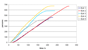 The data gathered from the single run contain the progess of the evacuation of each person. The extraction of the data of the specific exit is uncomplicated. Thus evacuation curves for