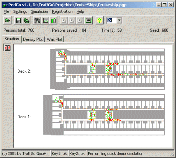 Screenshot of PedGo, simulating the evacuation of the two aft firezones of a cruise ship.
