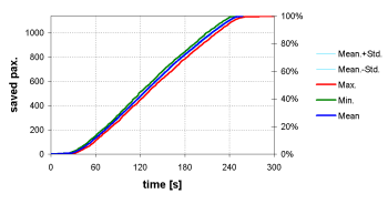 At first, a so called mean value simulation is performed. She consists out of many evacuation runs (e.g. 500) and gives you an overview, in what range the results can spread.